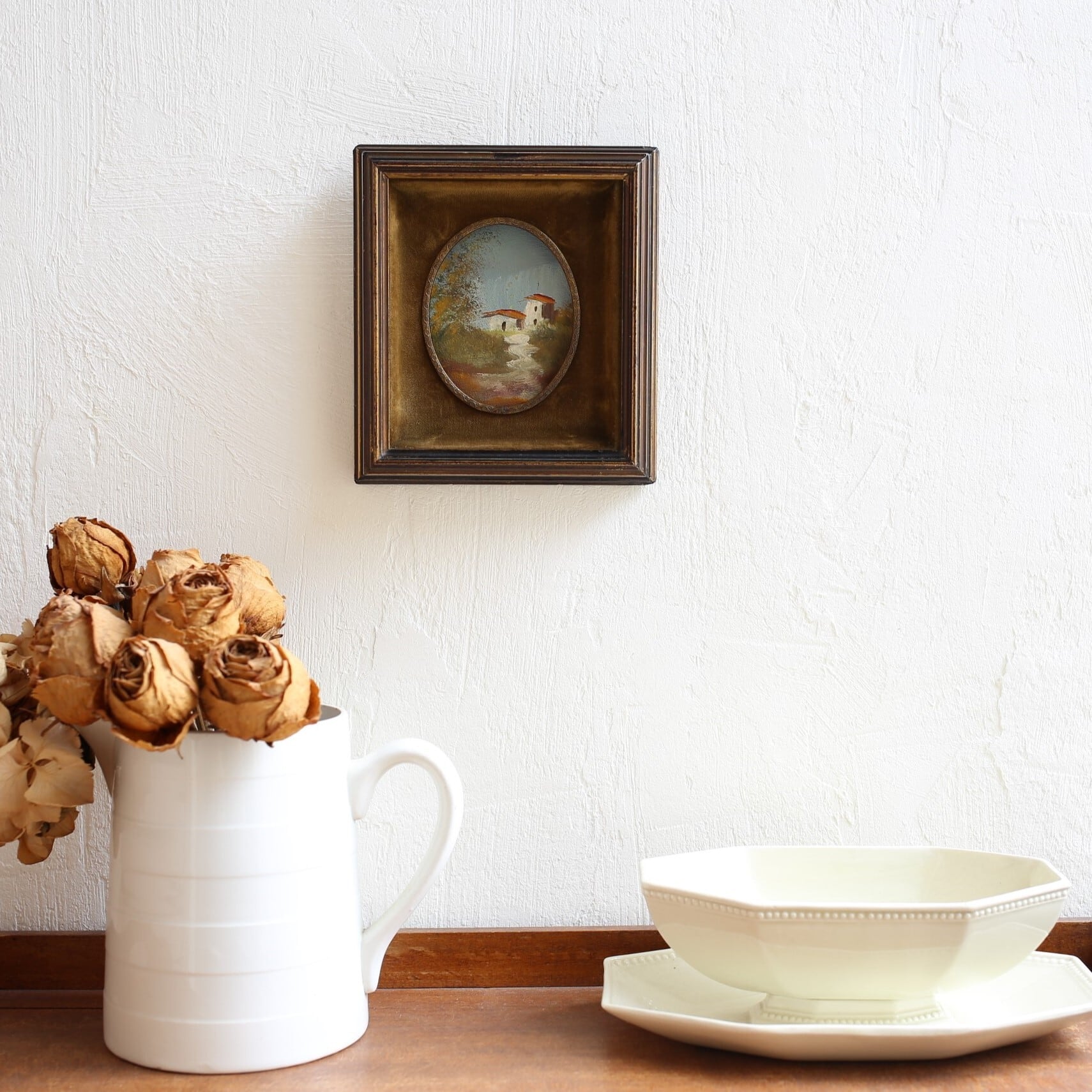 キャンバスに描かれた長閑な風景の油絵が絵を引き立てる素敵な額に収められています。