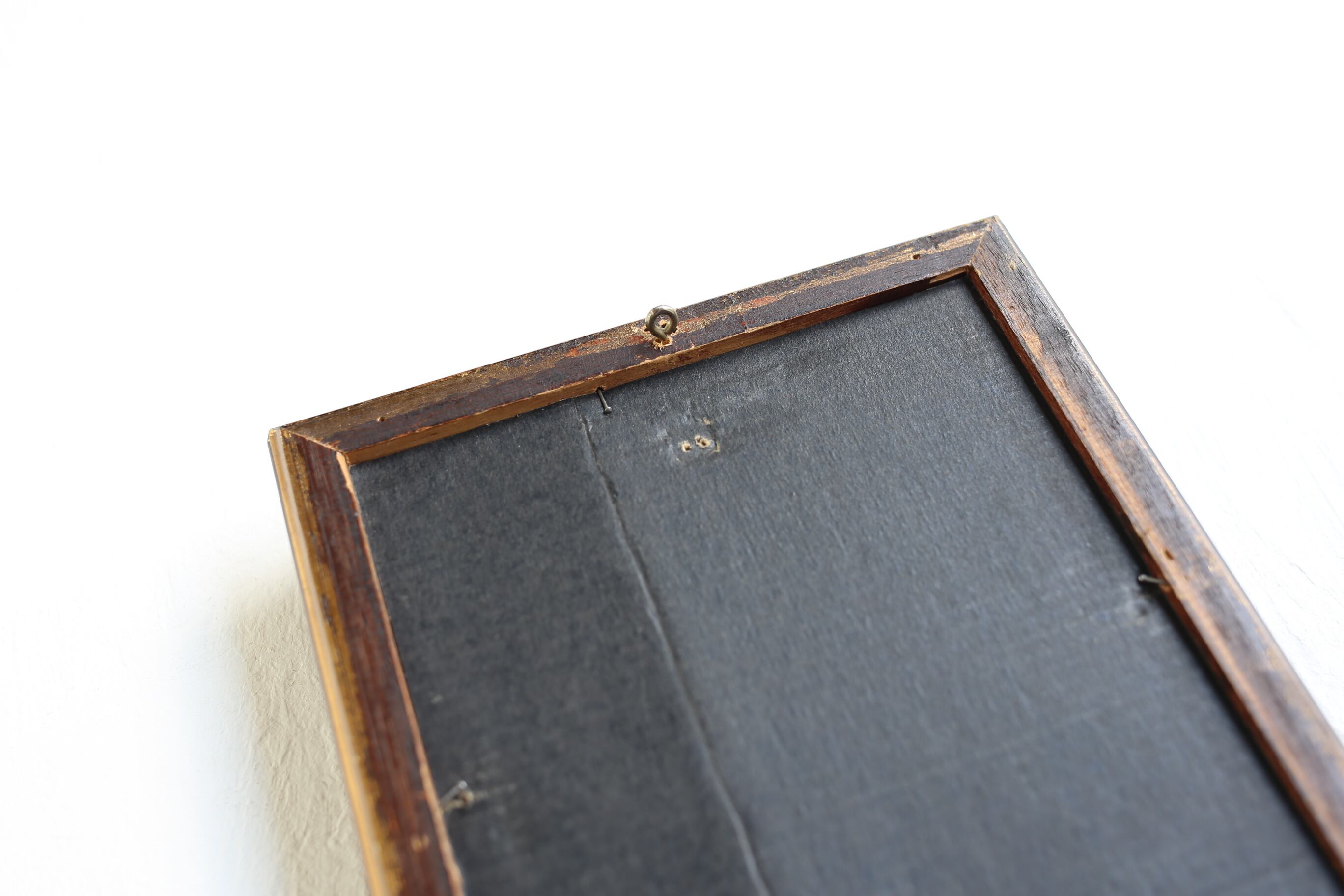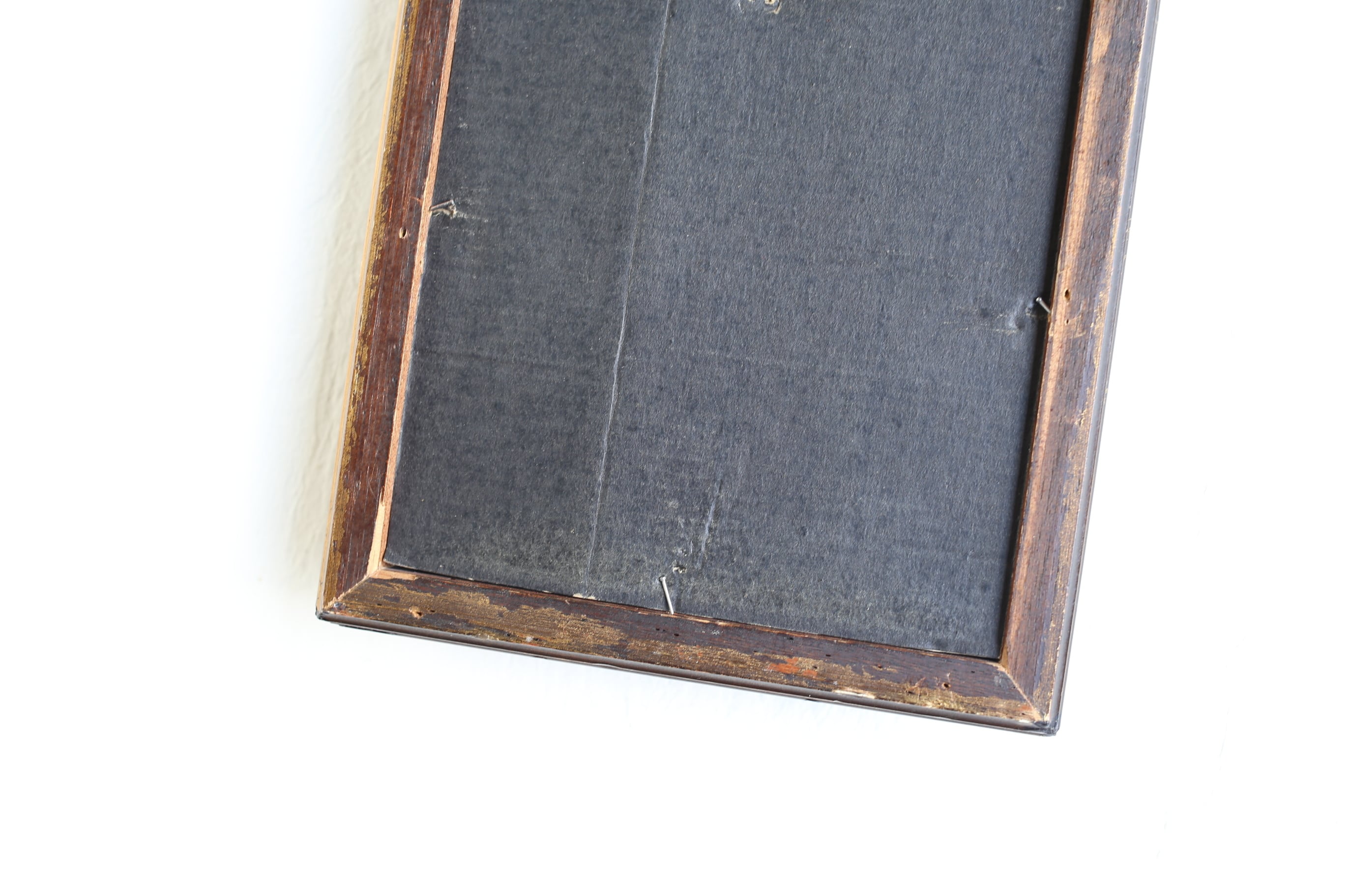 木製の額縁の縁のところどころにカケやスレがあり、黒で補色されている箇所も見られますが、本来の雰囲気を損なうほどのものではないと思います。