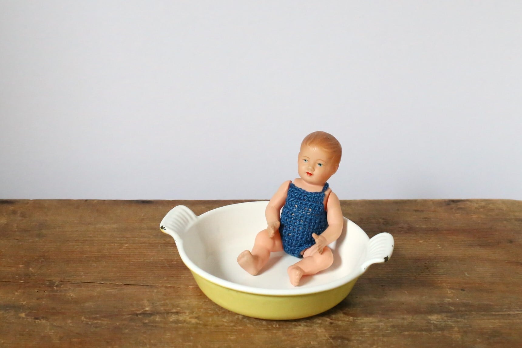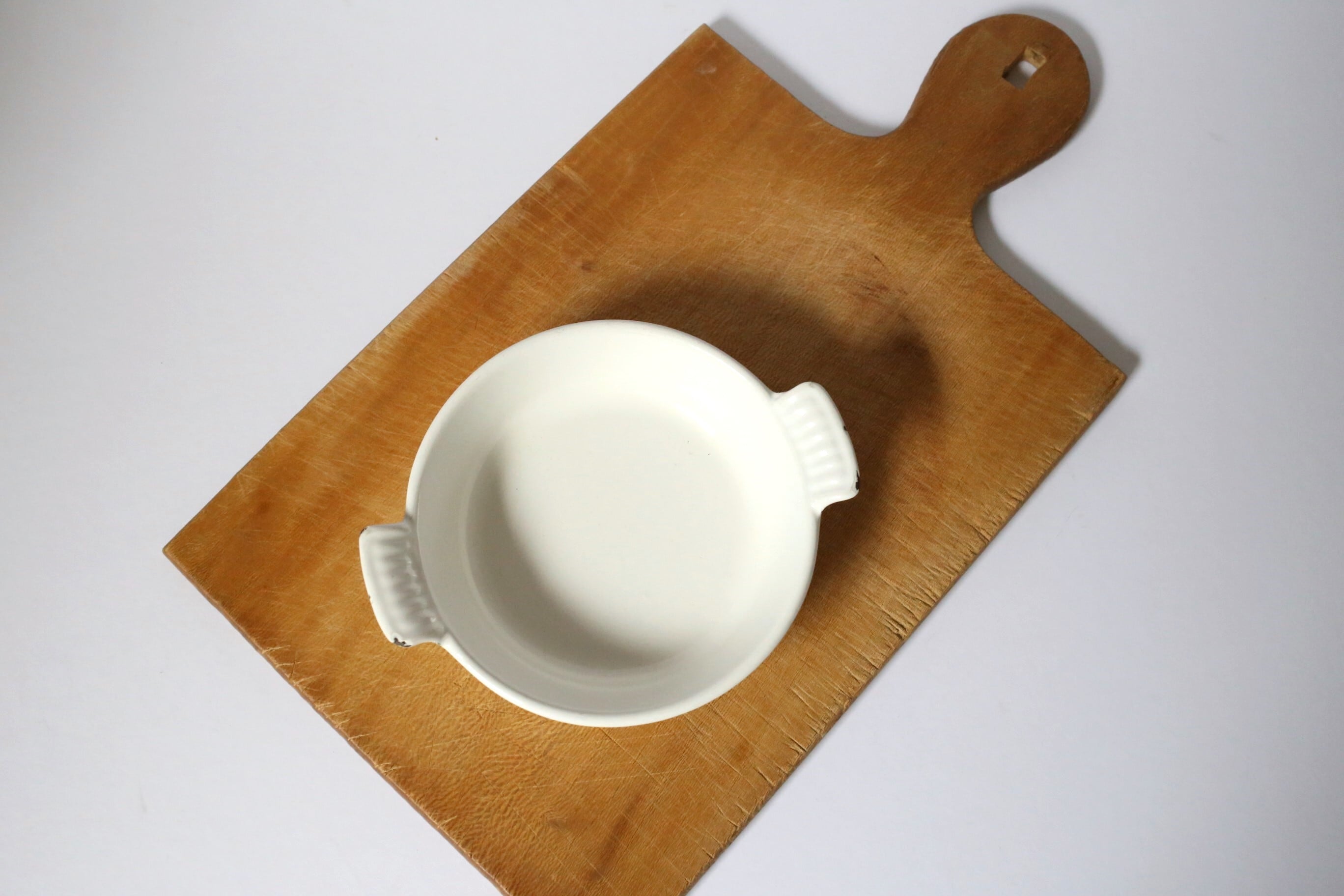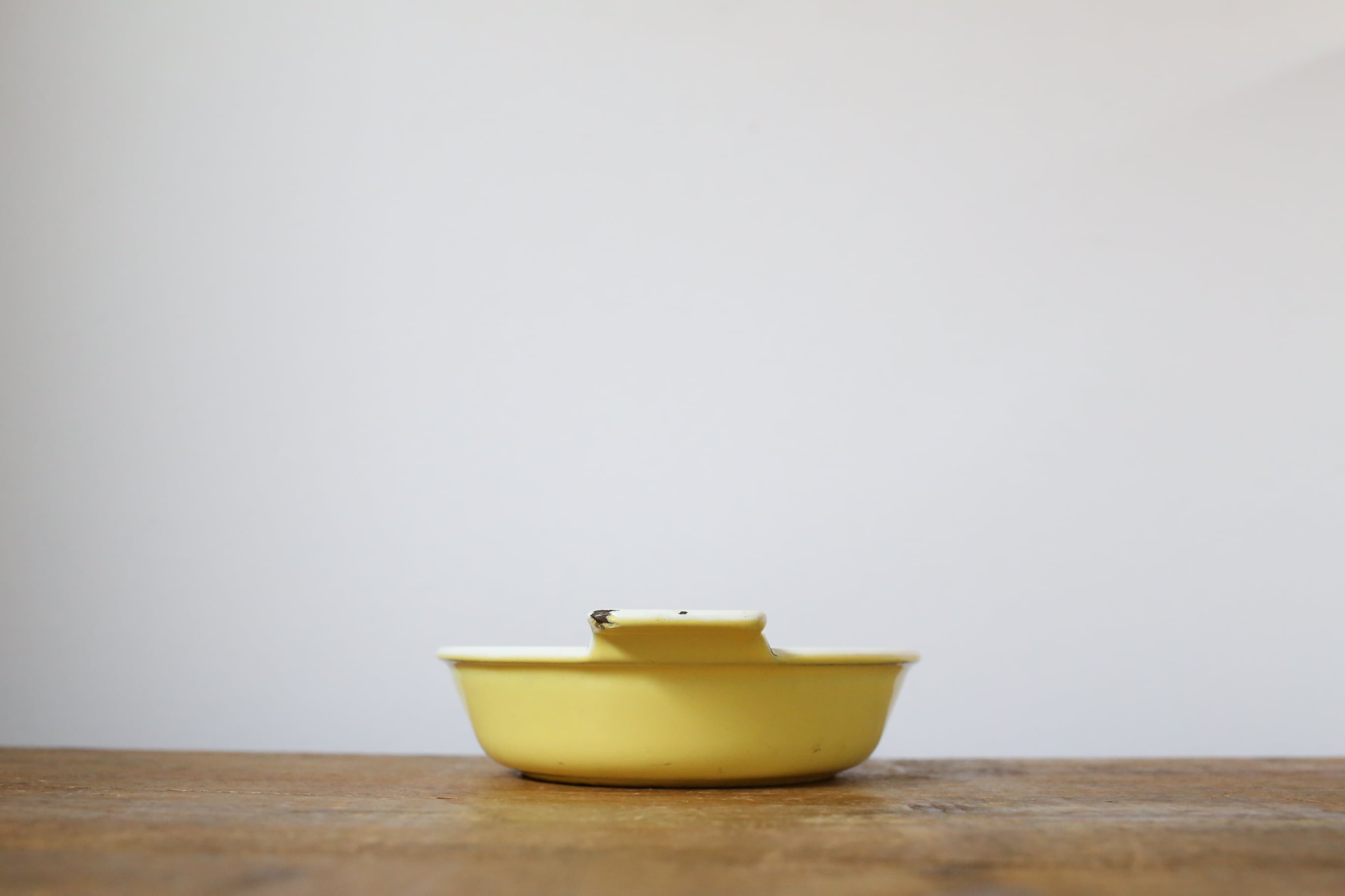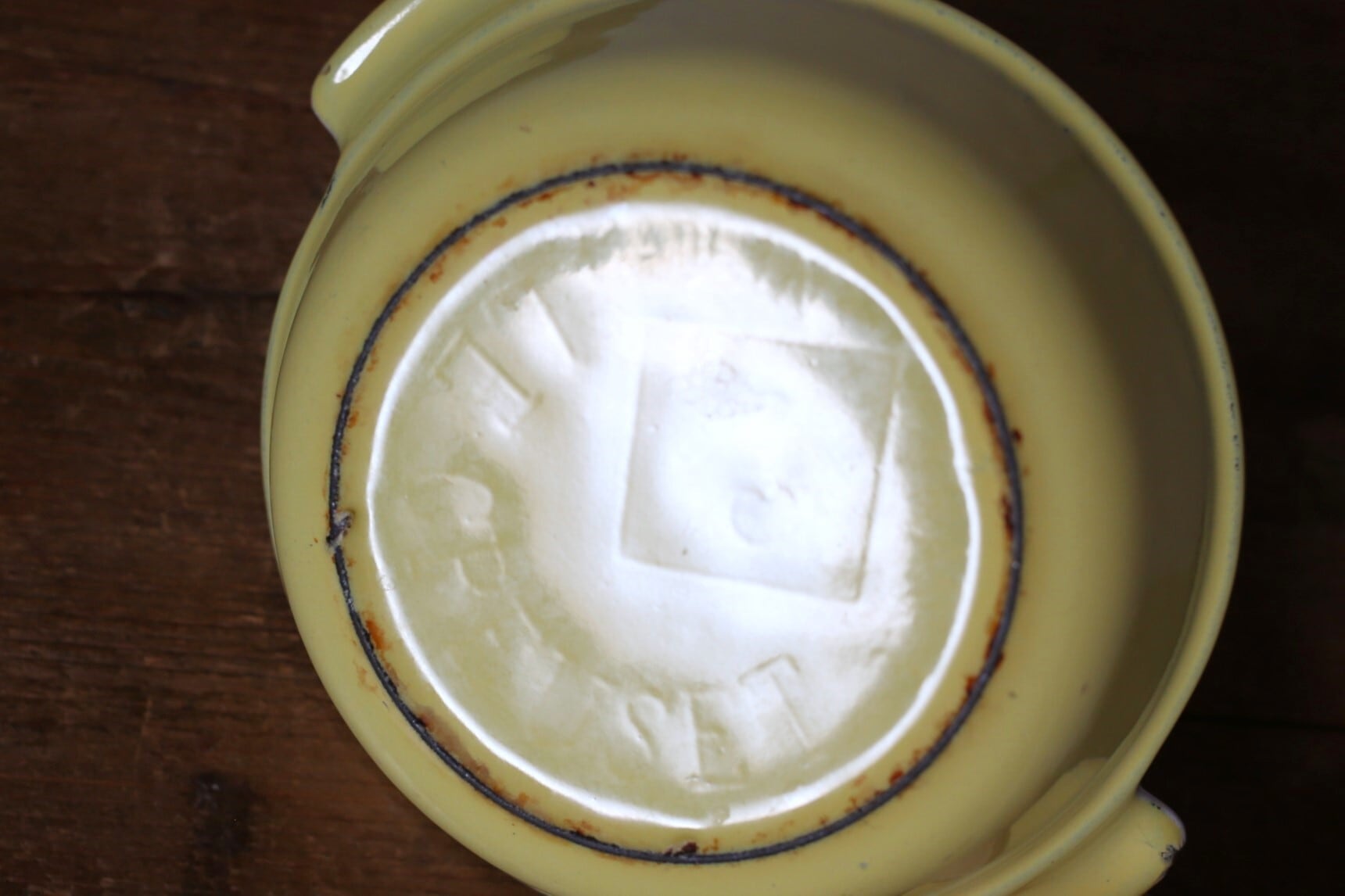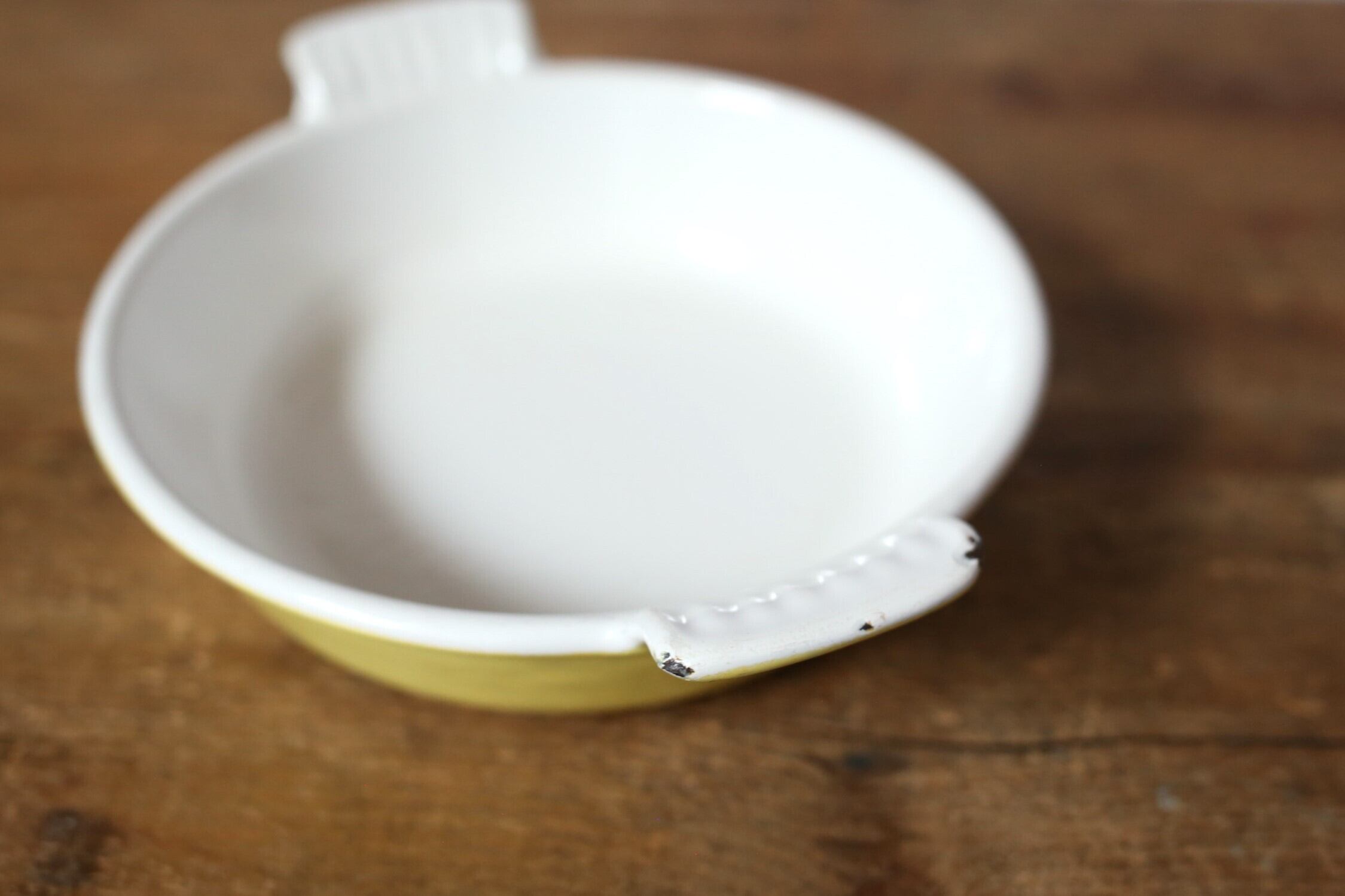 ヴィンテージ ル・クルーゼのやさしい黄色(ペールイエロー、レモンイエロー)が可愛らしいブリュレ皿、小さなグラタン皿です。