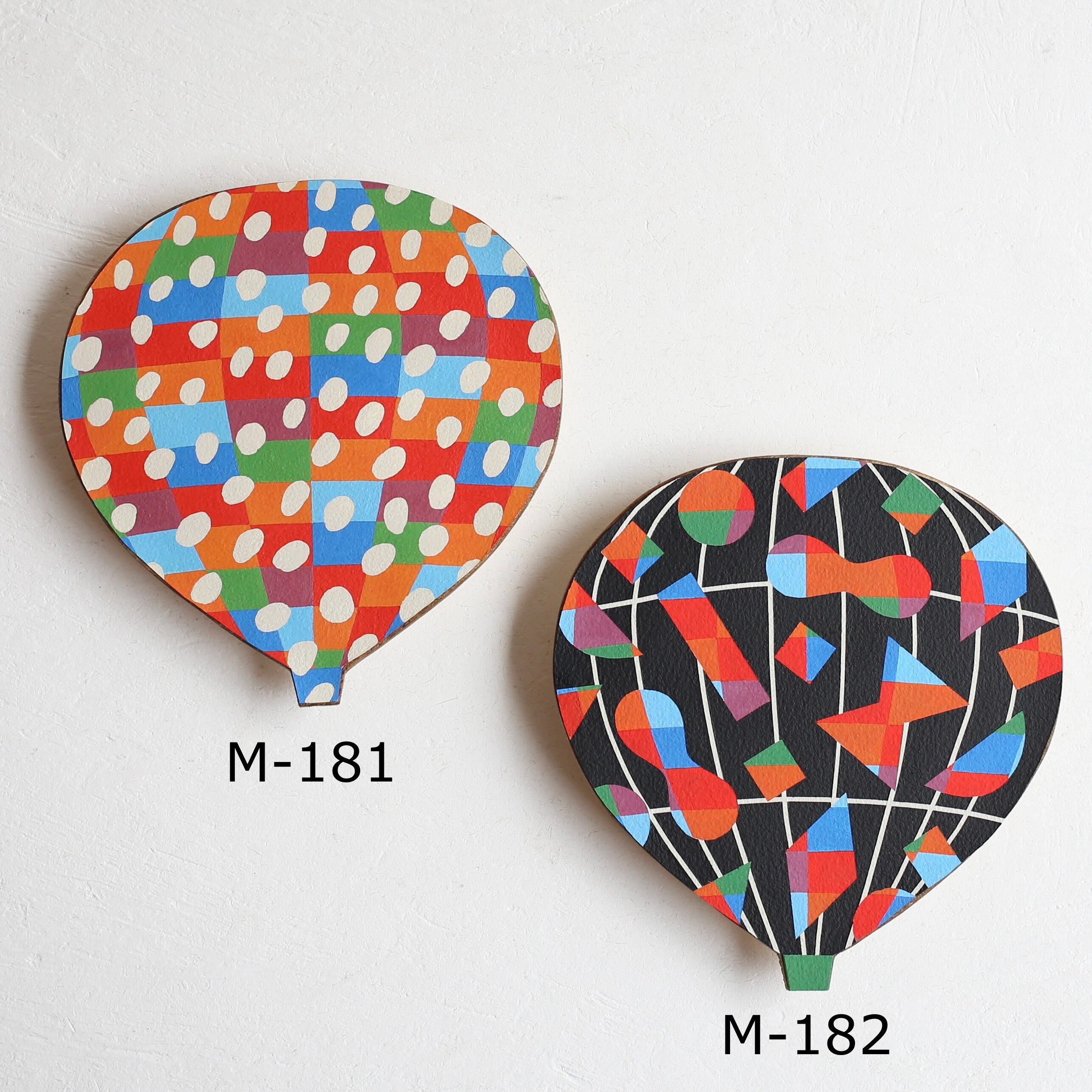 気球型に加工した木製板を土台に制作した手描きのアクリル画です。