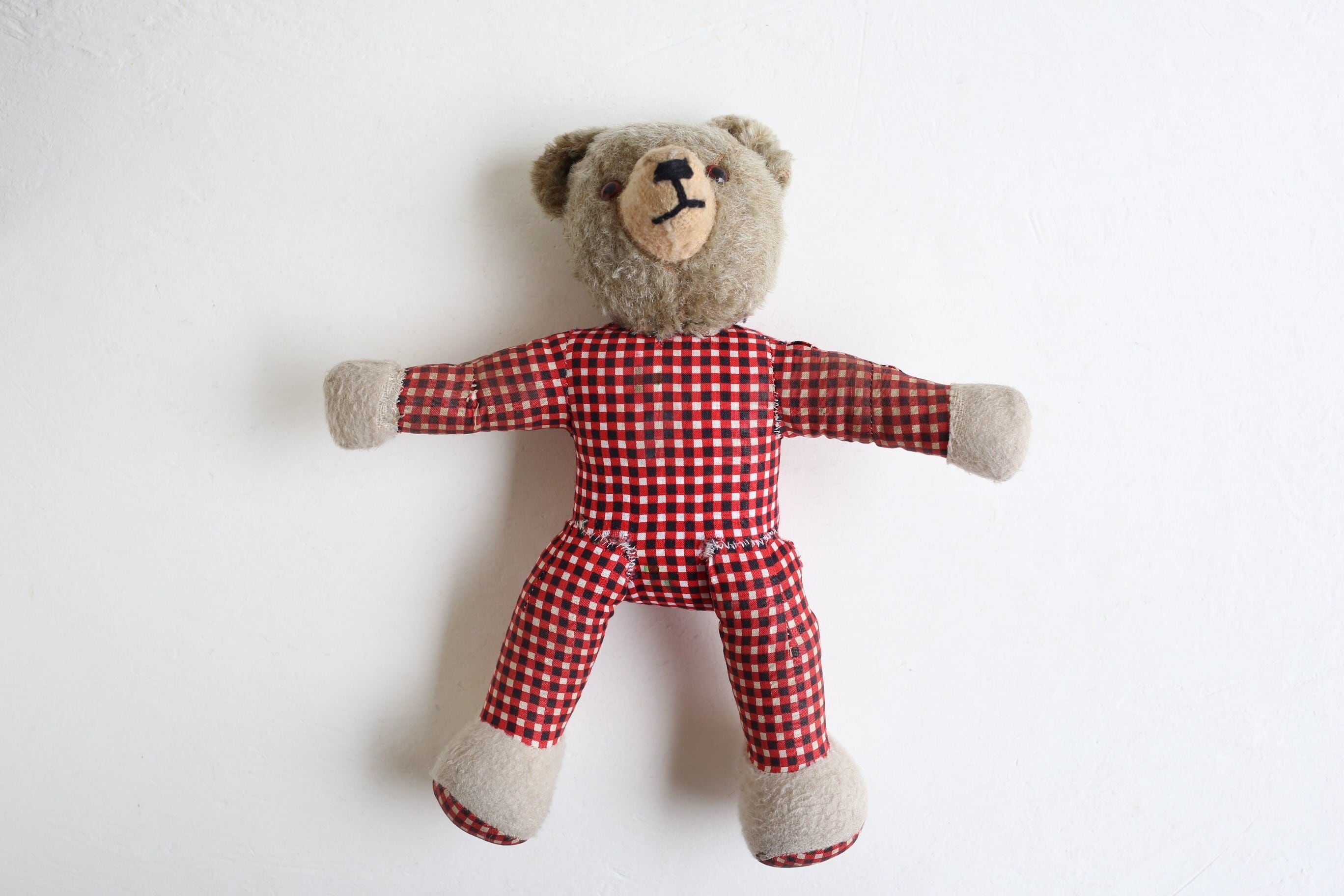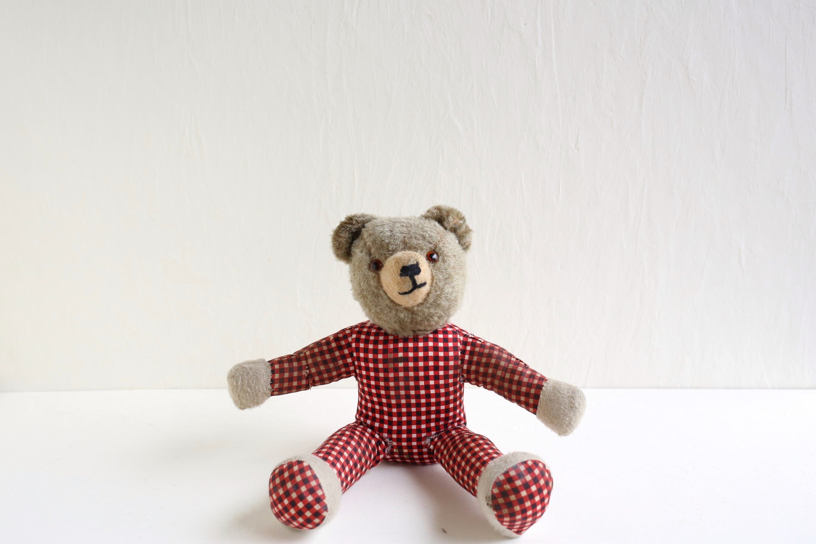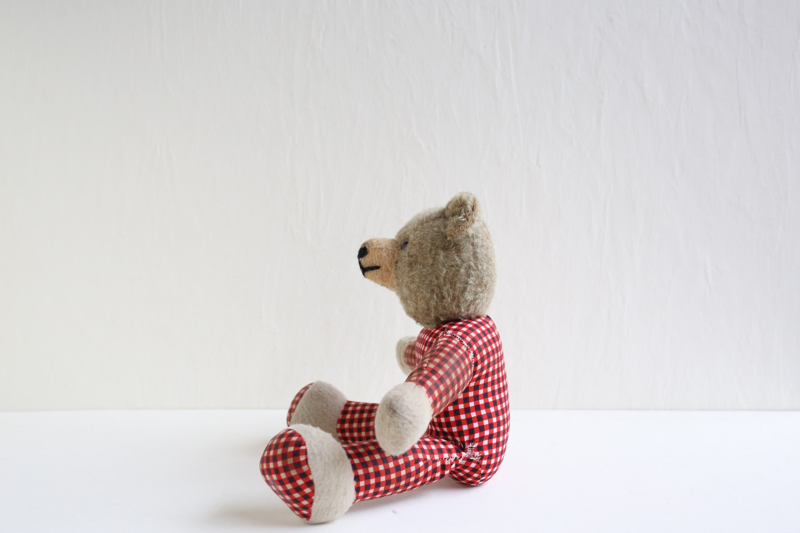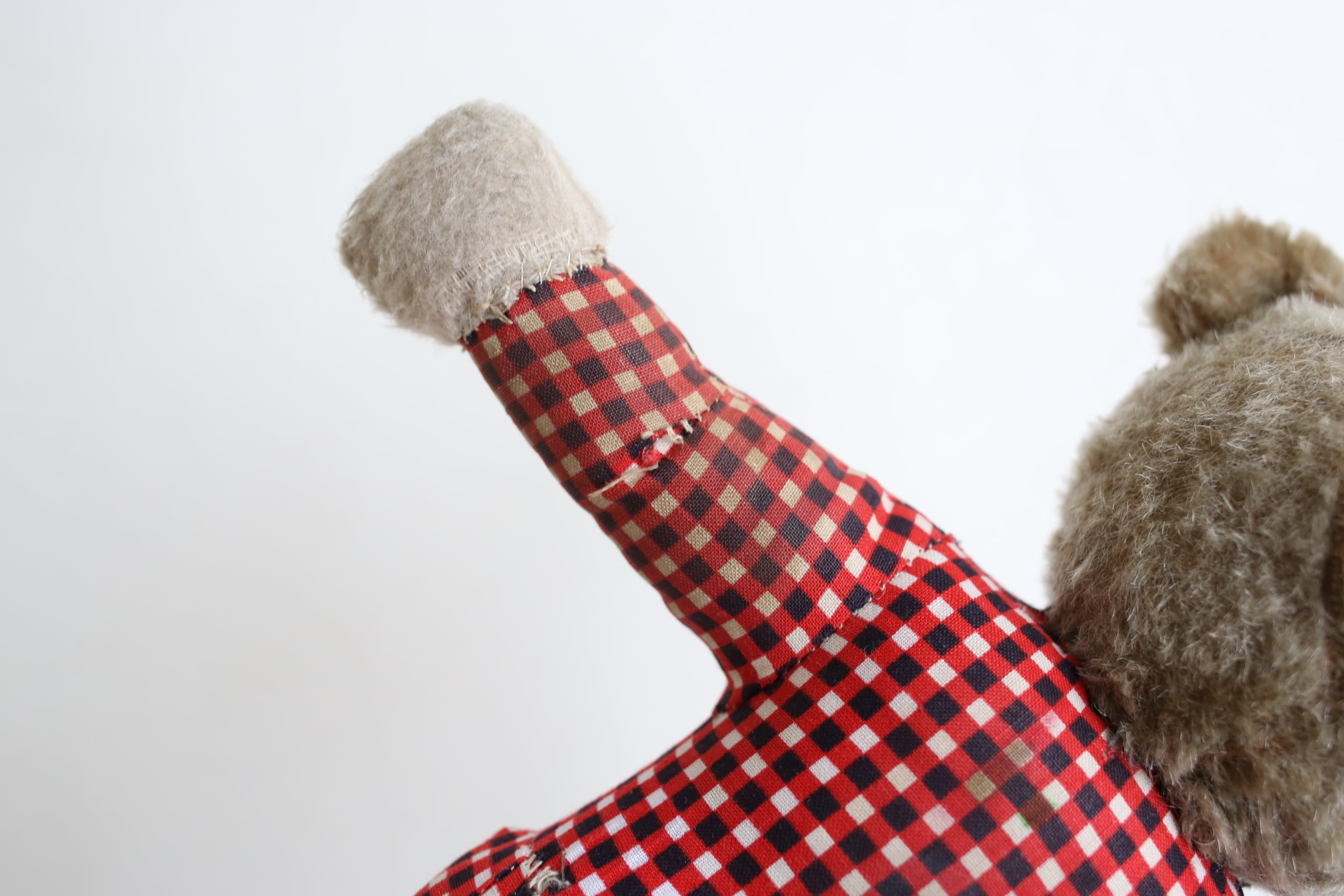 チェックの洋服部分はインク染みや汚れ、ステッチに少しホツレも見られますが、全体的には長い期間可愛がられてきた趣きがある素敵なベアです。