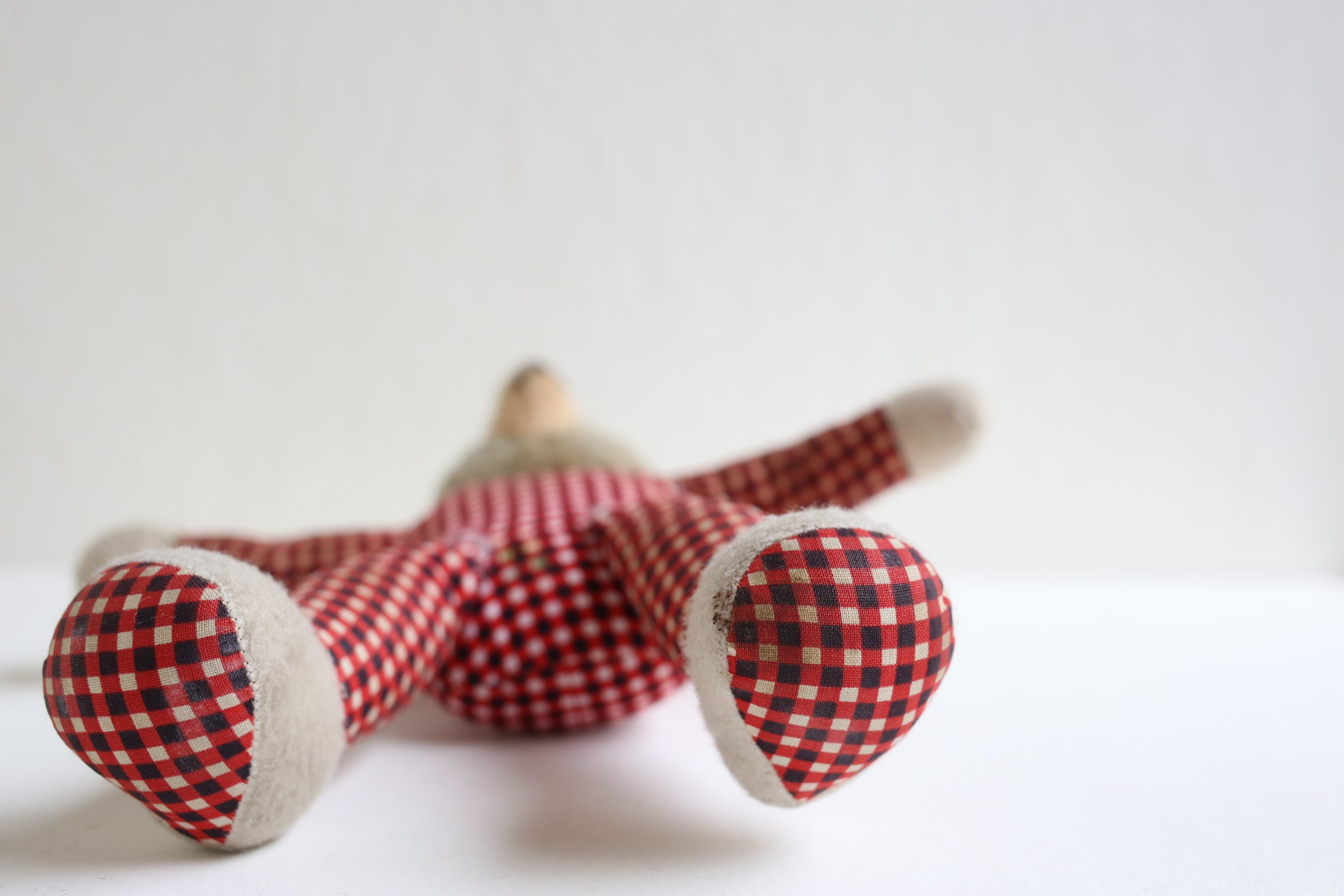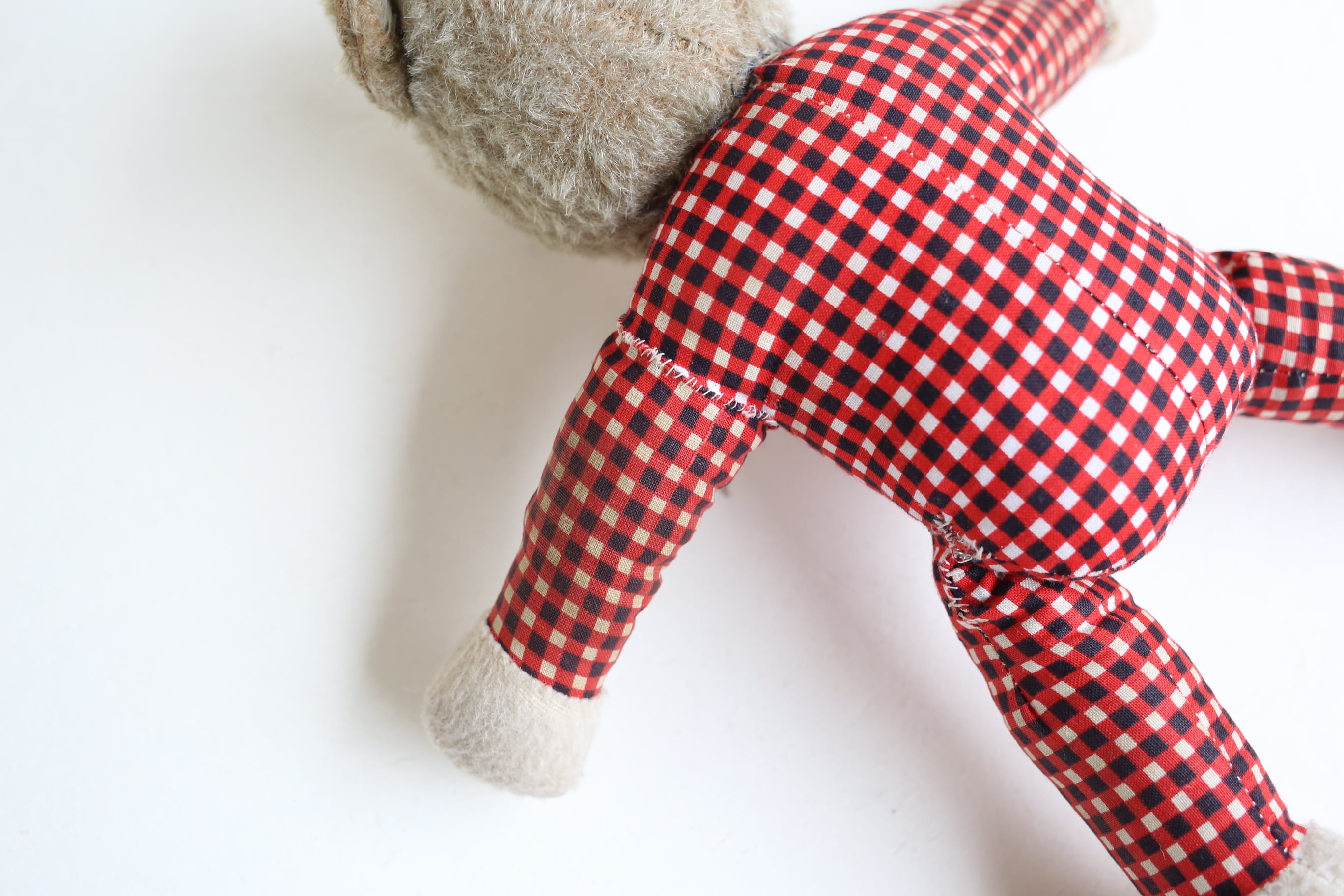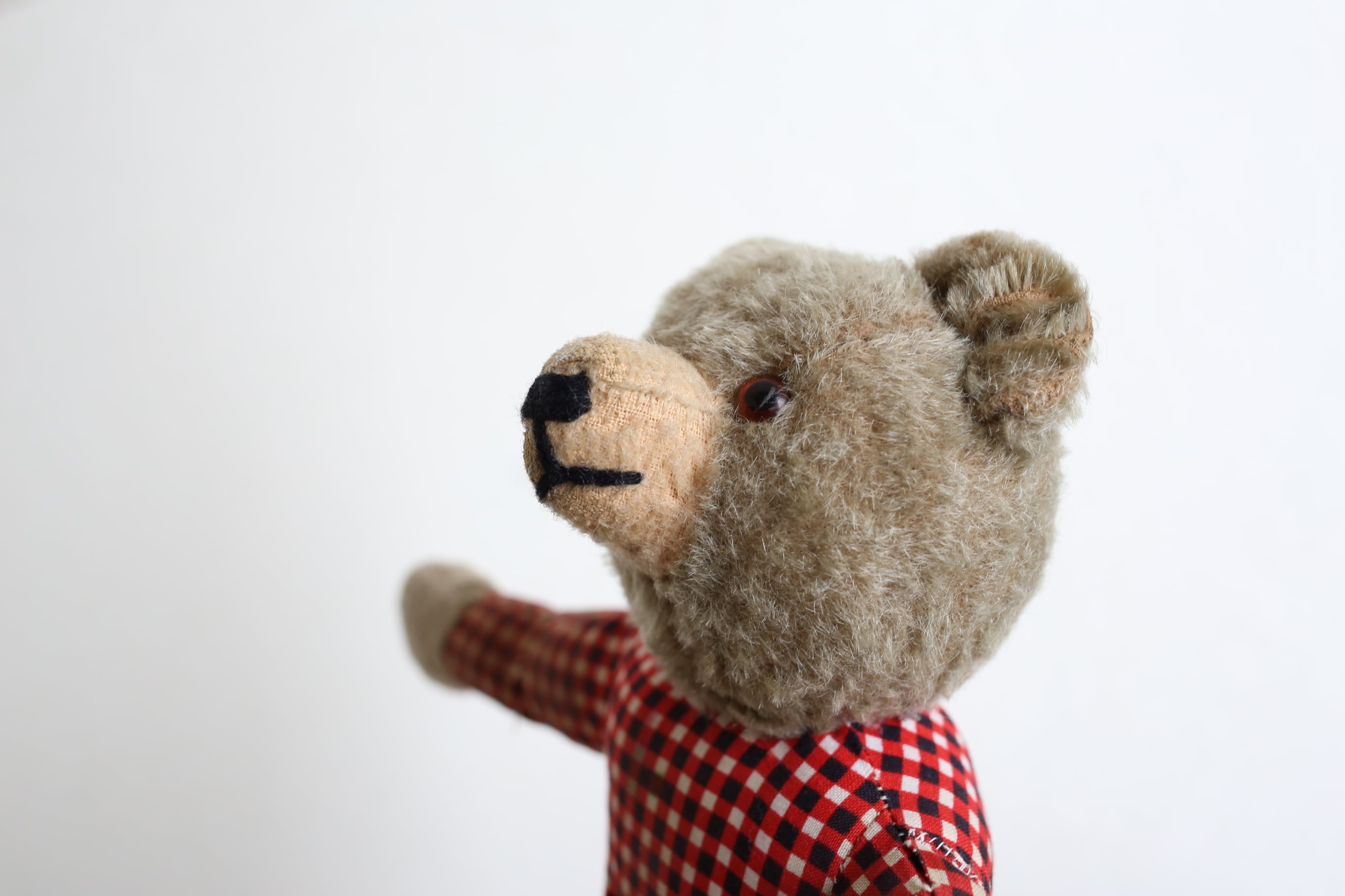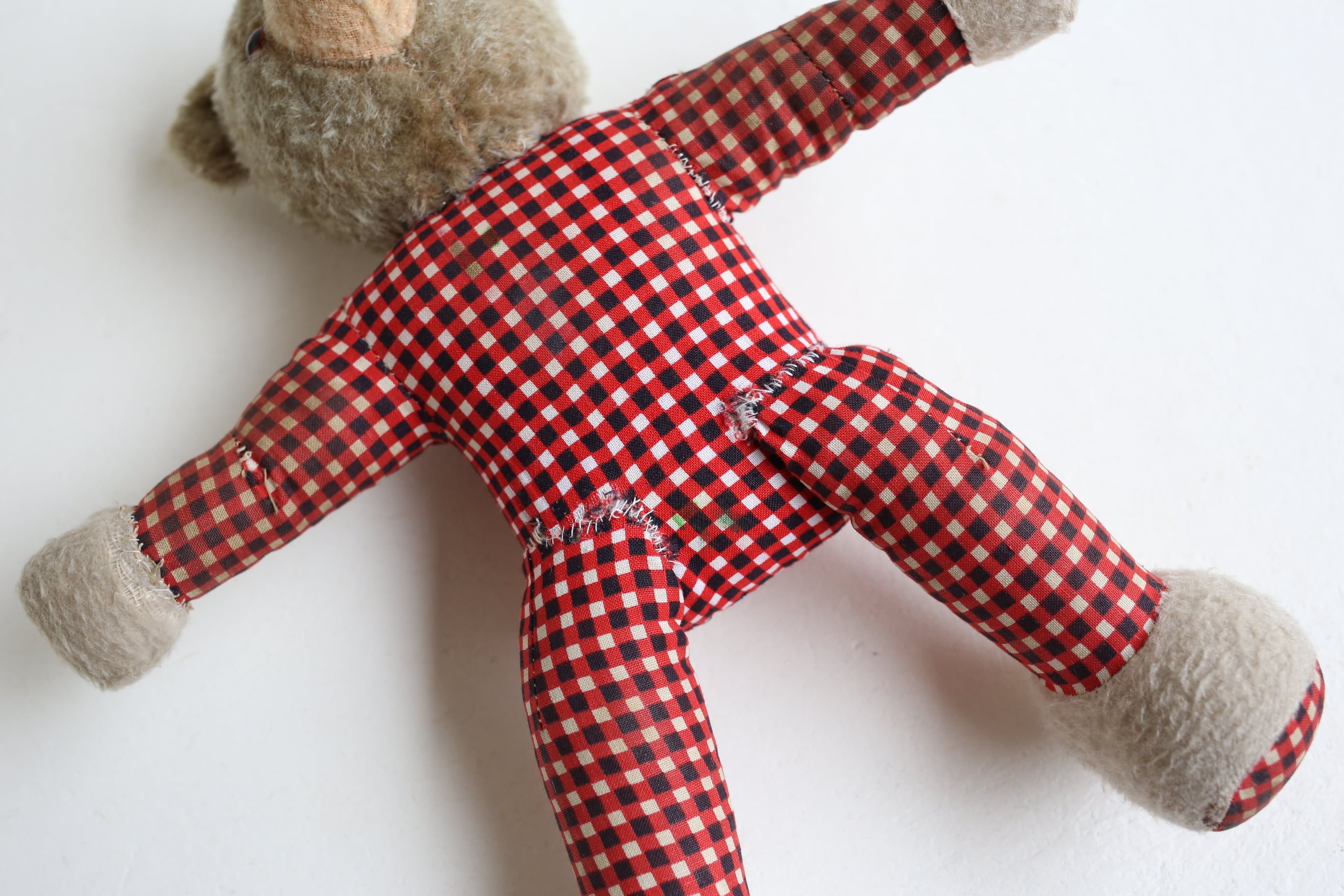 チェックの洋服部分はインク染みや汚れ、ステッチに少しホツレも見られますが、全体的には長い期間可愛がられてきた趣きがある素敵なベアです。