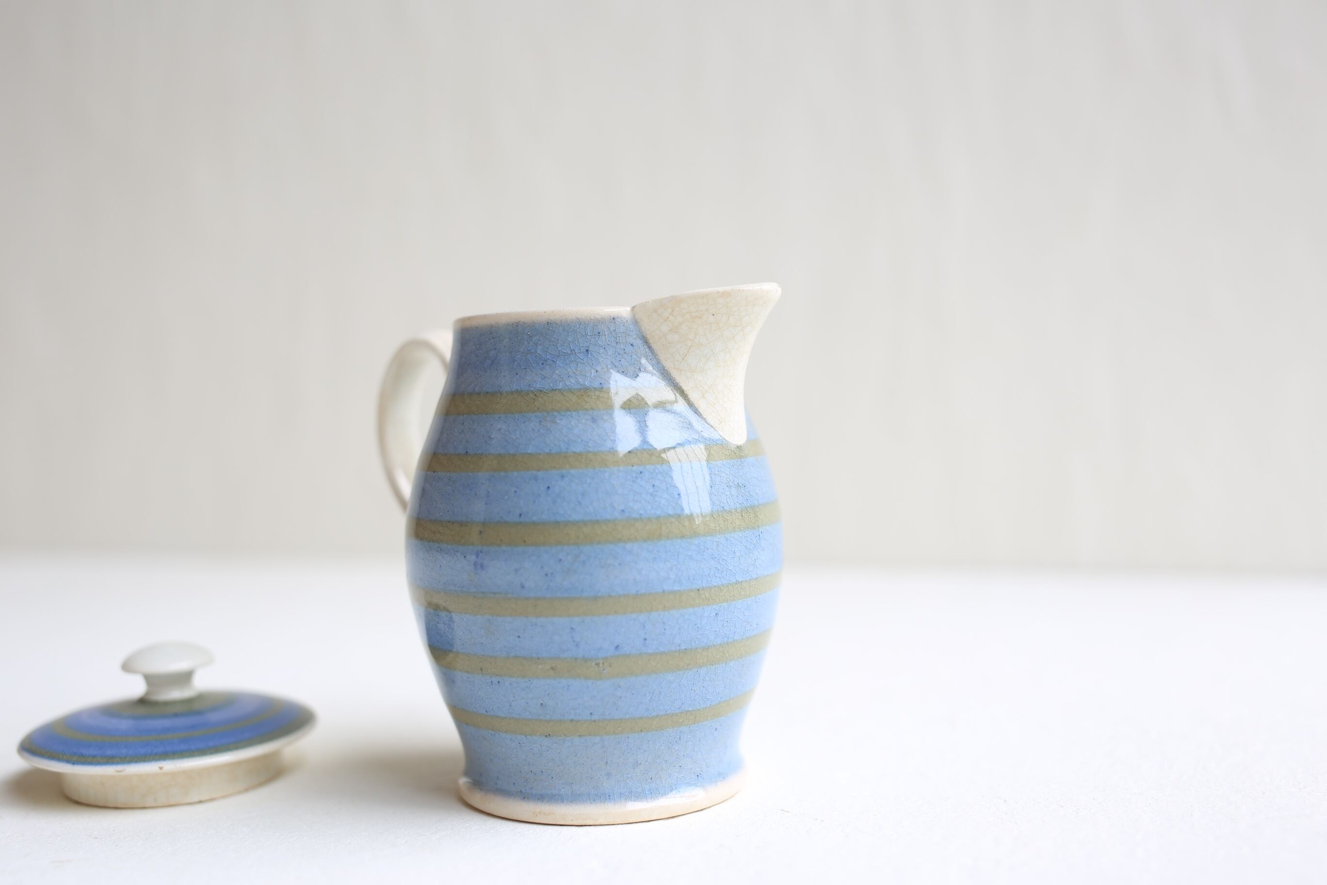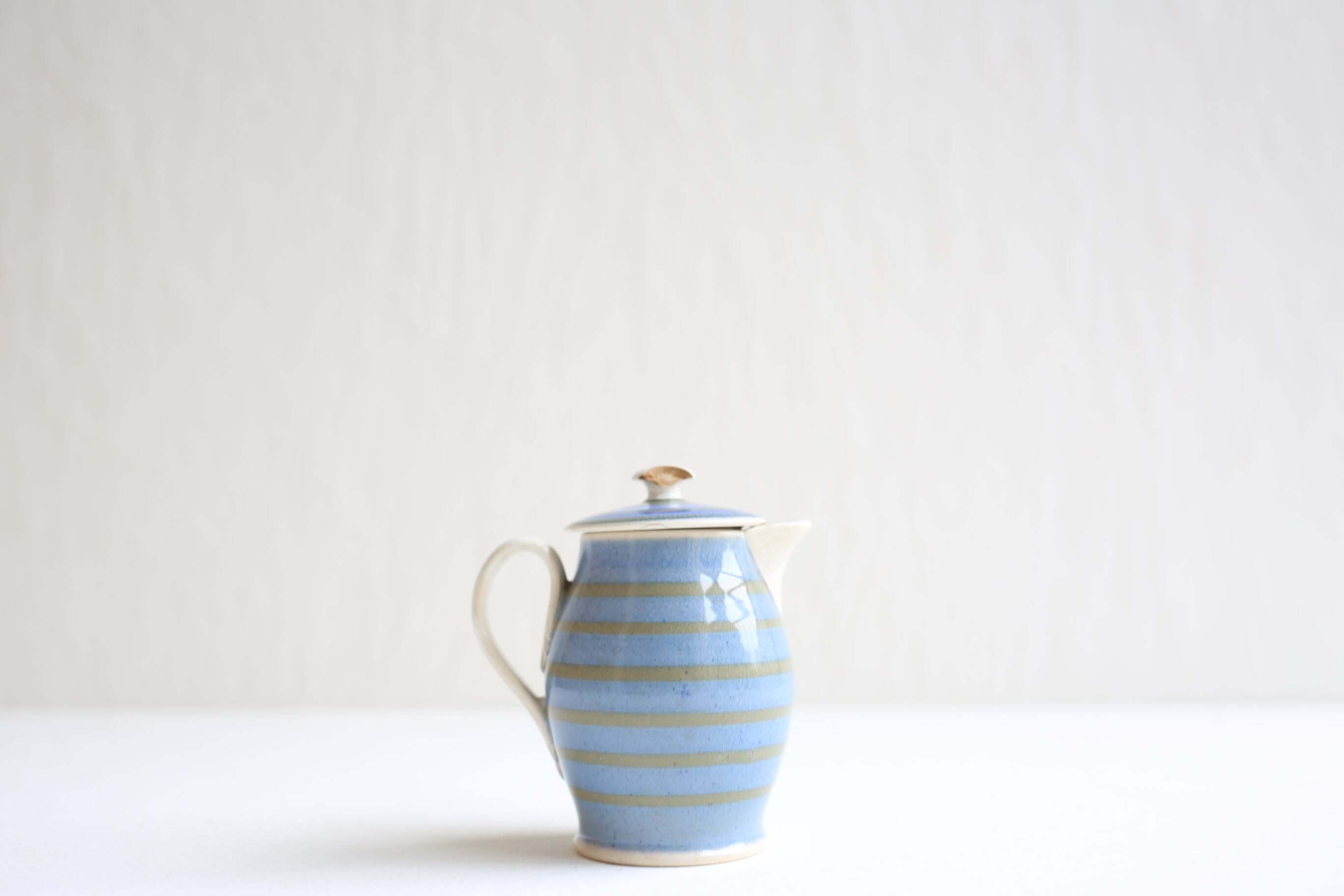 ブルーにカーキのボーダー柄はモダンな印象もありながら、全体に入った細かい貫入や滑らかな釉薬と合わさって大変優美な雰囲気を醸し出しています。