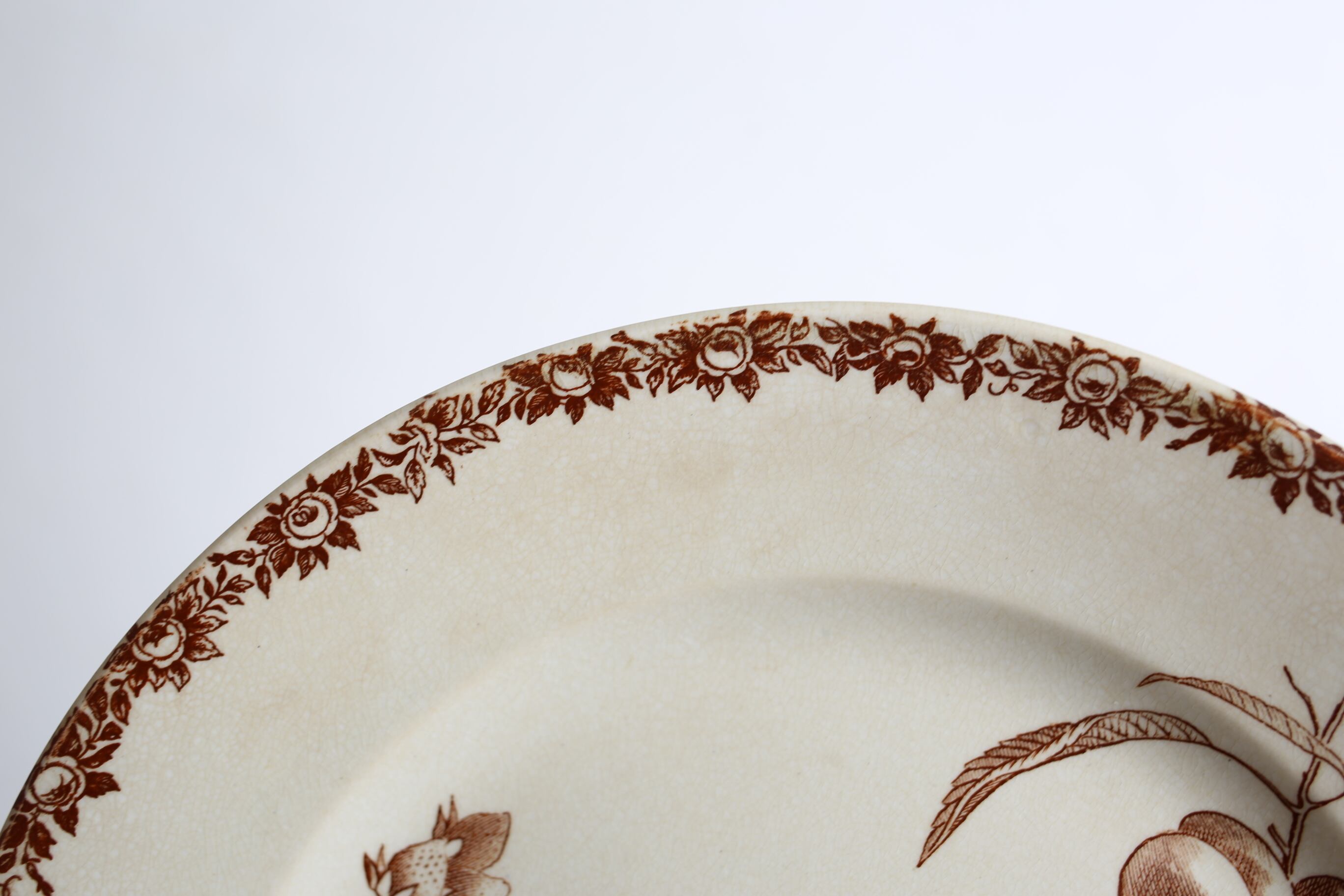 枝付きの果物と縁のガーランドがブラウンでシックに描かれた素敵なプレートです。