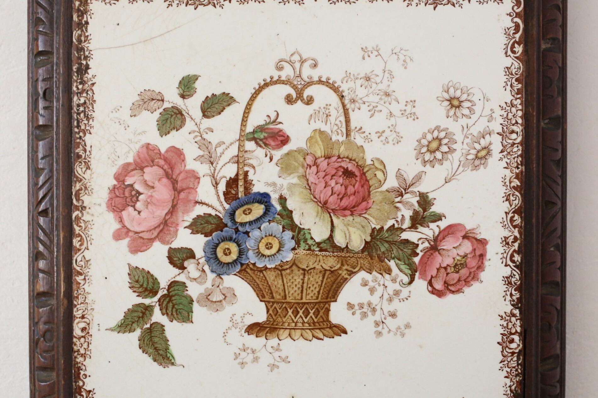 フランス アンティーク 鍋敷き トリベット 木枠×陶器タイル ポリクロームのブーケ N-05740