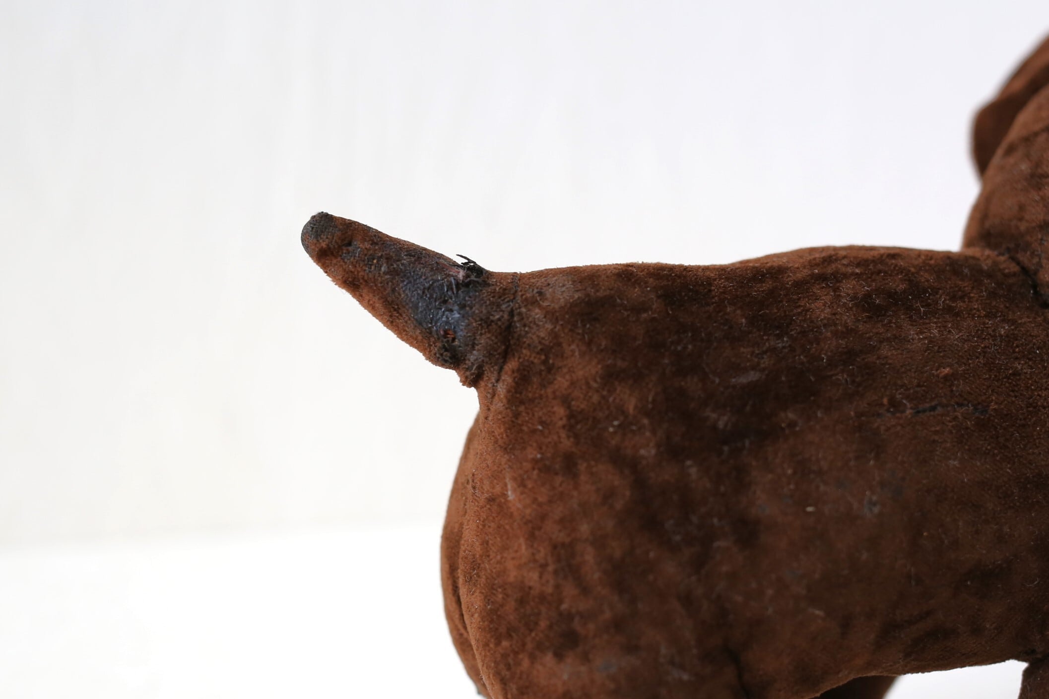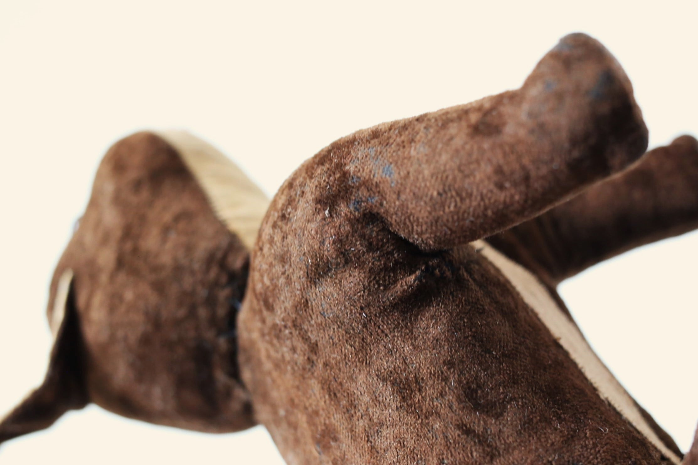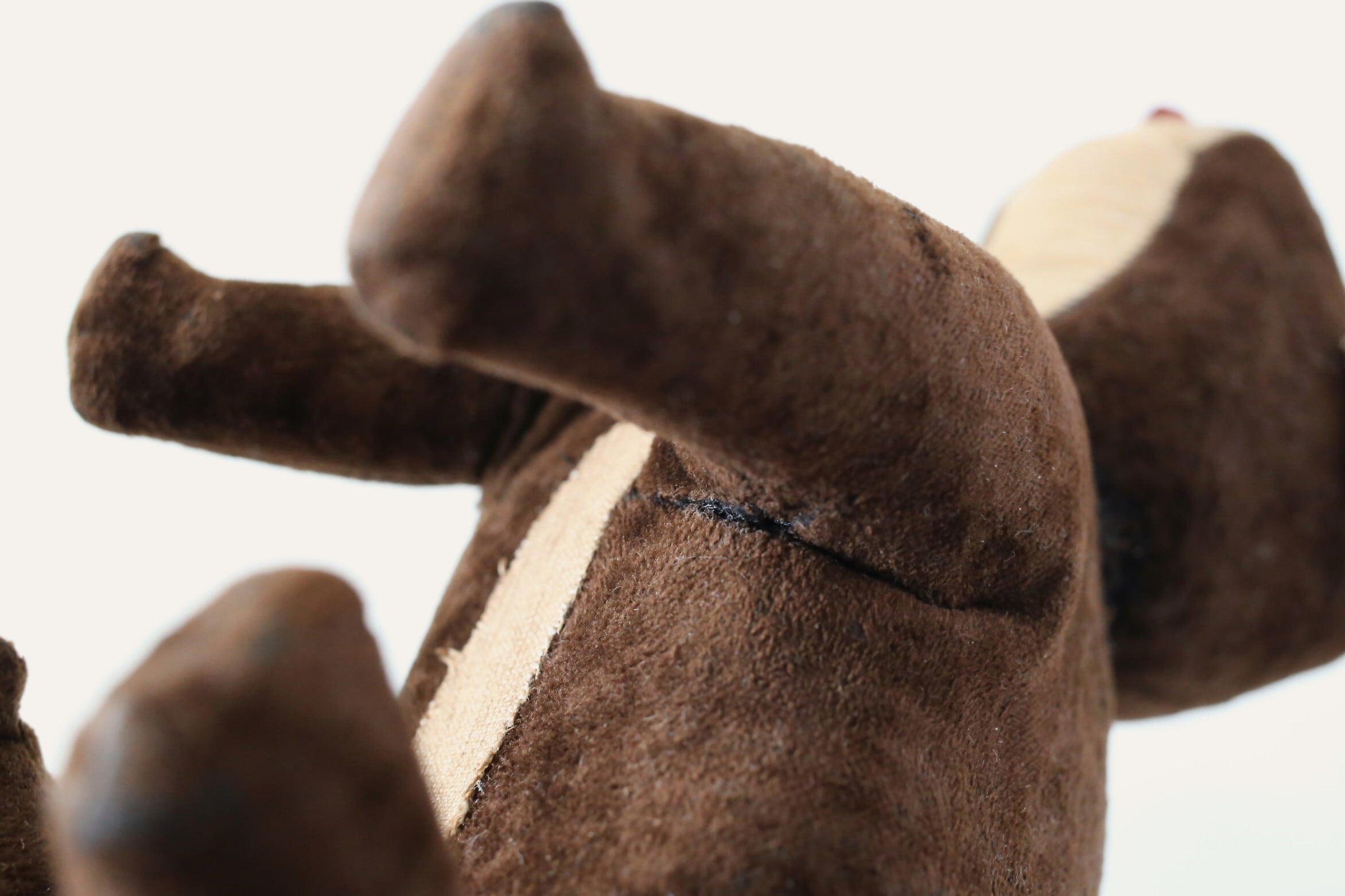 首や脚の付け根、尻尾に生地の薄れや裂けの補修跡があります。